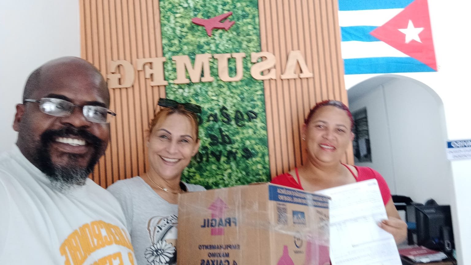 Momento de entrega y preparación de carga con destino internacional. Nuestro equipo trabaja con responsabilidad, organización y cercanía, garantizando que cada envío llegue seguro a su destino. En ASUM.FG conectamos personas, negocios y oportunidades con confianza.
